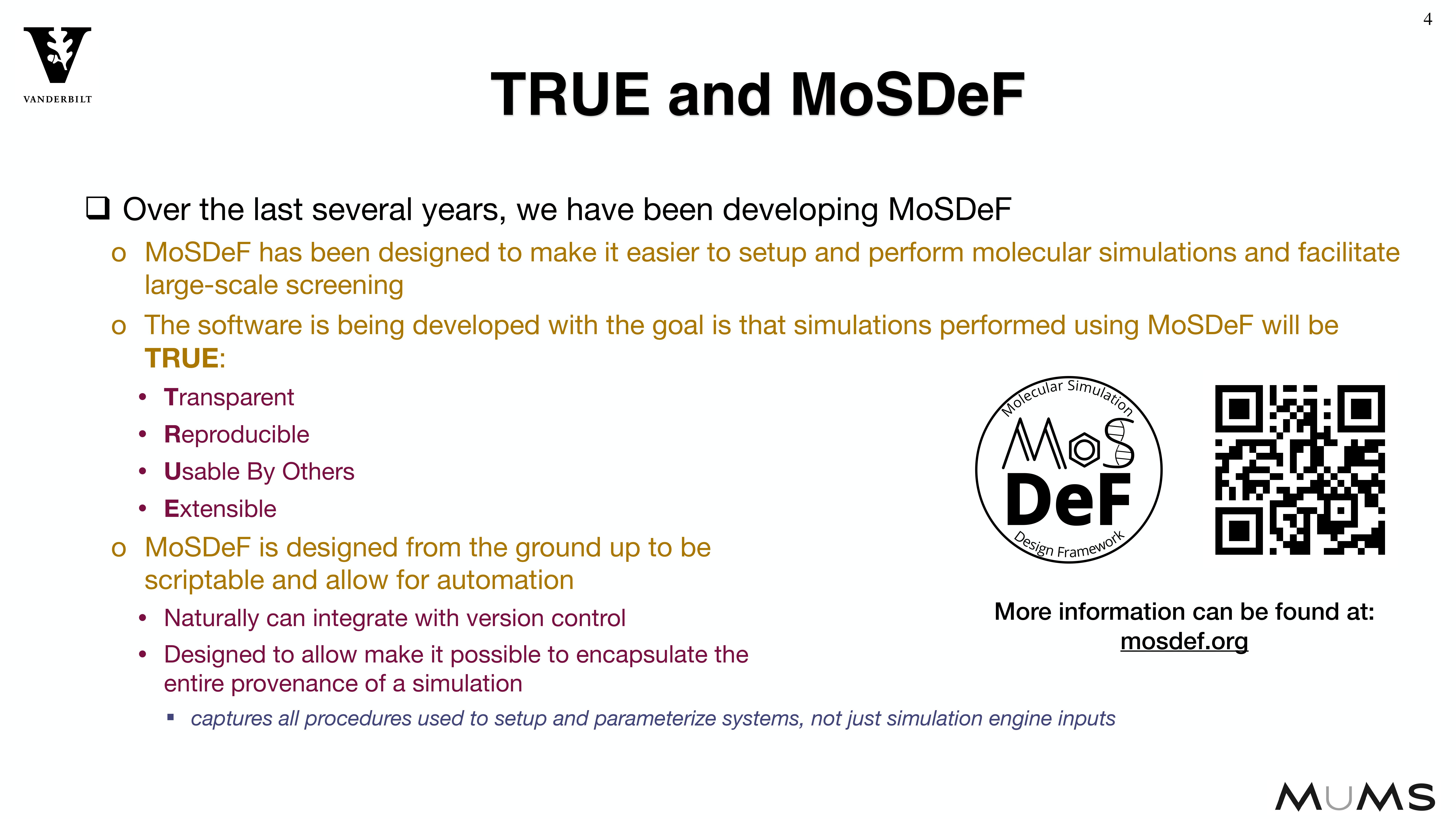 Through the MoSDeF integrated framework, the exact procedures used to set up and perform simulation workflows and associated metadata (i.e. the provenance) can be scripted, encapsulated, version-controlled, preserved, and later reproduced by other researchers. This allows molecular simulation studies to be conducted and published in a manner that is TRUE : “Transparent, Reproducible, Usable by others, and Extensible .” The following paper highlights these principles in details.